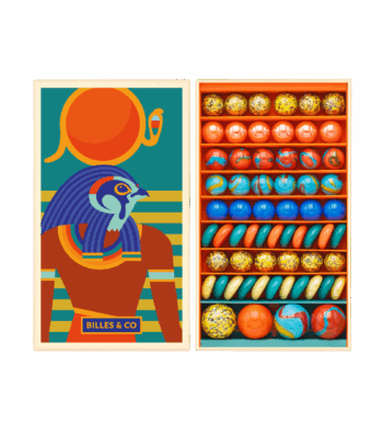 Eine Auswahl an marmorierten Murmeln, die an die Reliefs und Farben der schönsten Berglandschaften erinnern. Öffnen Sie die Schachtel und begeben Sie sich auf eine einzigartige Trekking-Tour, bei der jede Reihe von Murmeln die Elemente der Landschaft widerspiegelt. Wandern Sie zwischen Felsen und majestätischen Tannen, bewundern Sie den mäandernden Fluss und machen Sie eine Pause am Wasser. Setzen Sie Ihren Weg fort und bewundern Sie die Berge, deren Reliefs von den Strahlen der untergehenden Sonne durchflutet werden.